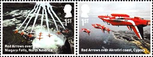 11 Großbritannien - 11. Großbritannien: 8-wertige Serie und Block mit 4 Werten „60 Jahre Red Arrows“, Mi-Nr. 5448-55 und Block 173(5456-59), Beispielabbildung: aus Block 173(5456-59) Formationsflüge des Folland Gnat T.Mk.1 und des BAe Hawk T.Mk.1A -