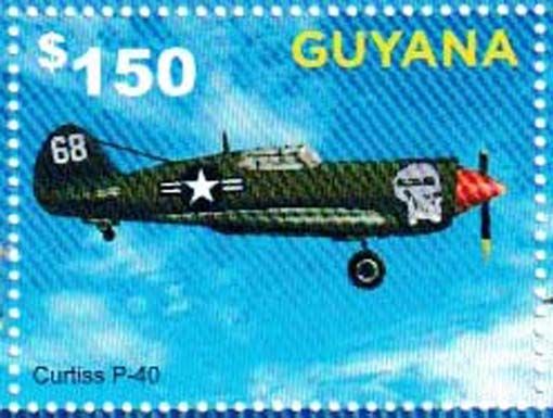 14 Guyana - Kleinbogen mit 6 Werten und Block mit 2 Werten „Flugzeuge aus dem II. Weltkrieg“, noch ohne Mi.-Nr., Beispielabbildung eines Wertes aus dem Kleinbogen: Curtiss P-40N Warhawk -