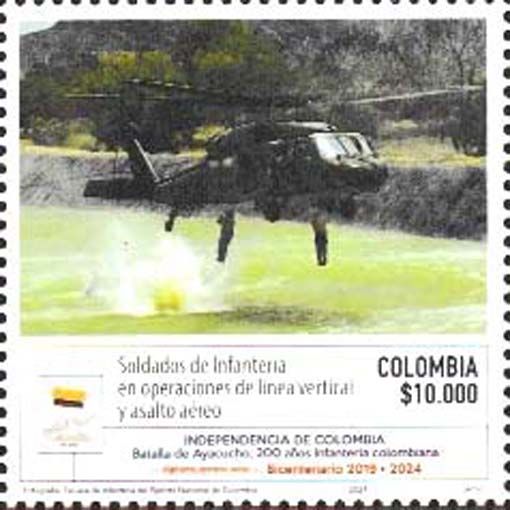 19 Kolumbien - 2 Marken aus 8-wertiger Serie „200 Jahre kolumbianische Infanterie“, noch ohne Mi.-Nr., Beispielabbildung: Sikorsky AH-60L Arpia (UH-60L) -