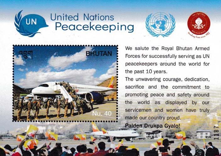 02 Bhutan -Block mit Einzelmarke „Friedenssicherung der Vereinten Nationen“, noch ohne Mi.-Nr., Airbus A319-115 von Drukair- Royal Bhutan Airlines -