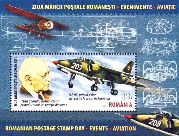 31 Rumänien - 4-wertige Serie und 2 Blocks „Tag der Briefmarke / Luftfahrt“, Mi.-Nr. 8367-70, Block 1006(8367-70) und Block 1007(8371), Beispielabbildung: Block 1007(8371) IAR 93MB Vultur, Henri Coanda -