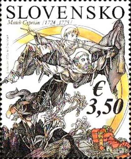 37 Slowakei - Block Mi.-Nr. 64(1026) „300. Geburtstag von Pater Fra Cyprian“, Markenabbildung: Pater Fra Cyprian und dessen Gleitflugapparat -