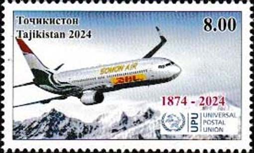 41 Tadschikistan - Einzelmarke „150 Jahre UPU“, noch ohne Mi.-Nr. Boeing 737-900ER von Somon Air / DHL -