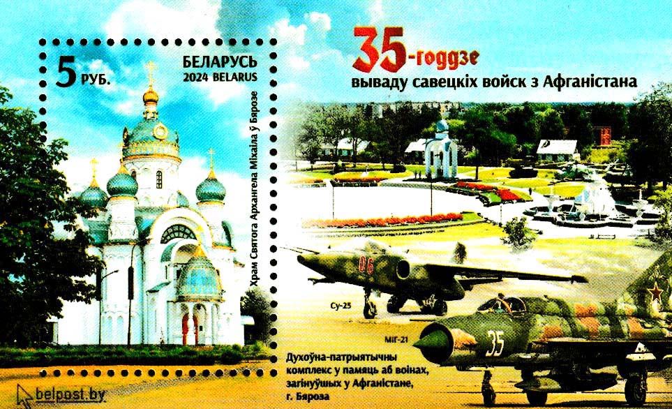 45 Weißrussland - Block Mi.-Nr. 237(1552) „35. Jahrestag der Rückkehr der sowjetischen Streitkräfte aus Afghanistan“, Blockrandabbildungen Mil Mi-24, Mil Mi-8T, Sukhoi Su-25, MiG-21MT