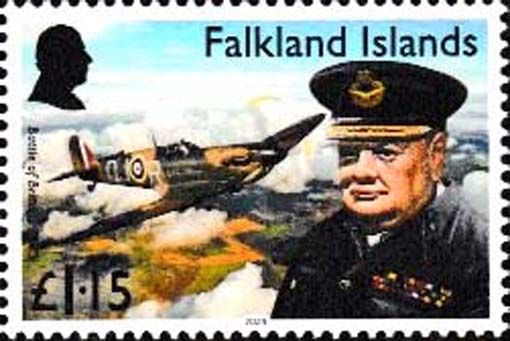 05 Falklandinseln - Einzelwert aus 4-wertiger Serie „150. Geburtstag von Winston Churchill“, noch ohne Mi.-Nr.: Churchill in der Uniform eines Air Commodore der RAF, Supermarine Spitfire Mk.IIA „Falkland Islands“ -